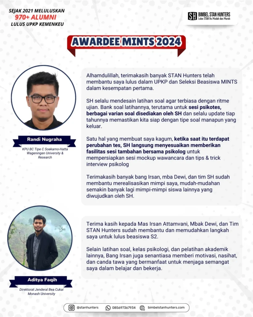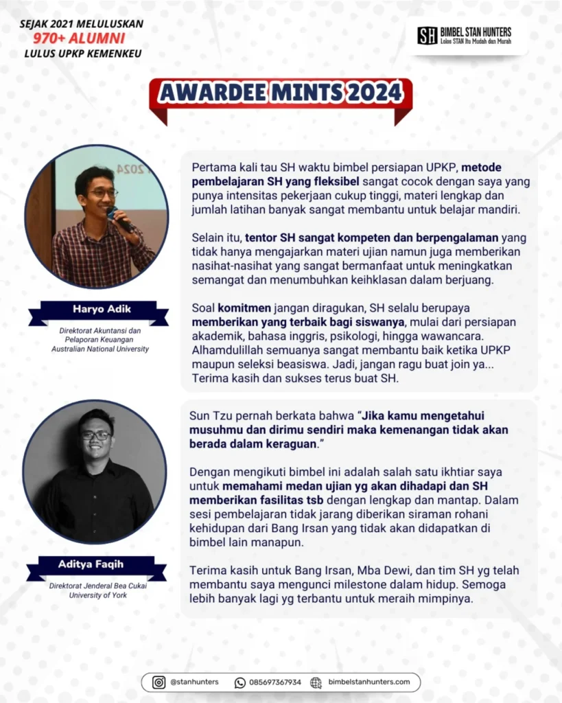 [{"id":"2430","link":"https:\/\/bimbelstanhunters.com\/tahapan-seleksi-dan-jadwal-pendaftaran\/","name":"tahapan-seleksi-dan-jadwal-pendaftaran","thumbnail":{"url":"https:\/\/bimbelstanhunters.com\/wp-content\/uploads\/2025\/12\/bimbel-stan-terbaik.webp","alt":""},"title":"Tahapan Seleksi dan Jadwal Pendaftaran PKN STAN Tahun 2026","author":{"name":"taufan.0531@gmail.com","link":"https:\/\/bimbelstanhunters.com\/author\/taufan-0531gmail-com\/"},"date":"Apr 14, 2026","dateGMT":"2026-04-14 02:56:17","modifiedDate":"2026-04-15 01:25:51","modifiedDateGMT":"2026-04-15 01:25:51","commentCount":"0","commentStatus":"open","categories":{"coma":"<a href=\"https:\/\/bimbelstanhunters.com\/category\/info-pkn-stab\/\" rel=\"category tag\">Info PKN STAN<\/a>","space":"<a href=\"https:\/\/bimbelstanhunters.com\/category\/info-pkn-stab\/\" rel=\"category tag\">Info PKN STAN<\/a>"},"taxonomies":{"post_tag":""},"readTime":{"min":1,"sec":6},"status":"publish","content":"Politeknik Keuangan Negara STAN adalah kampus kedinasan di bawah Kementerian Keuangan yang membuka seleksi tiap tahun melalui jalur SPMB (Seleksi Penerimaan Mahasiswa Baru). Prediksi jadwal"},{"id":"20","link":"https:\/\/bimbelstanhunters.com\/latihan-soal-tkp\/","name":"latihan-soal-tkp","thumbnail":{"url":"https:\/\/bimbelstanhunters.com\/wp-content\/uploads\/2025\/10\/TKP.jpg","alt":""},"title":"LATIHAN SOAL SKD - TKP","author":{"name":"taufan.0531@gmail.com","link":"https:\/\/bimbelstanhunters.com\/author\/taufan-0531gmail-com\/"},"date":"Okt 19, 2025","dateGMT":"2025-10-19 04:38:25","modifiedDate":"2026-04-15 01:24:03","modifiedDateGMT":"2026-04-15 01:24:03","commentCount":"0","commentStatus":"open","categories":{"coma":"<a href=\"https:\/\/bimbelstanhunters.com\/category\/artikel-soal\/\" rel=\"category tag\">Artikel Soal<\/a>","space":"<a href=\"https:\/\/bimbelstanhunters.com\/category\/artikel-soal\/\" rel=\"category tag\">Artikel Soal<\/a>"},"taxonomies":{"post_tag":""},"readTime":{"min":0,"sec":35},"status":"publish","content":"Latihan soal SKD TKP (Tes Karakteristik Pribadi) membantu peserta memahami cara menjawab soal berbasis situasi yang menilai sikap, kepribadian, dan pengambilan keputusan. Melalui latihan yang"},{"id":"18","link":"https:\/\/bimbelstanhunters.com\/latihan-soal-tiu\/","name":"latihan-soal-tiu","thumbnail":{"url":"https:\/\/bimbelstanhunters.com\/wp-content\/uploads\/2025\/10\/TIU.jpeg","alt":""},"title":"LATIHAN SOAL TIU","author":{"name":"taufan.0531@gmail.com","link":"https:\/\/bimbelstanhunters.com\/author\/taufan-0531gmail-com\/"},"date":"Okt 19, 2025","dateGMT":"2025-10-19 04:38:25","modifiedDate":"2026-04-15 01:03:18","modifiedDateGMT":"2026-04-15 01:03:18","commentCount":"0","commentStatus":"open","categories":{"coma":"<a href=\"https:\/\/bimbelstanhunters.com\/category\/artikel-soal\/\" rel=\"category tag\">Artikel Soal<\/a>","space":"<a href=\"https:\/\/bimbelstanhunters.com\/category\/artikel-soal\/\" rel=\"category tag\">Artikel Soal<\/a>"},"taxonomies":{"post_tag":""},"readTime":{"min":0,"sec":33},"status":"publish","content":"Latihan soal TIU (Tes Intelegensi Umum) merupakan langkah penting untuk mengasah kemampuan berpikir logis, analitis, dan numerik dalam menghadapi seleksi sekolah kedinasan. Dengan rutin berlatih,"}] 3.000+ Siswa telah lolos ke STAN bersama kami